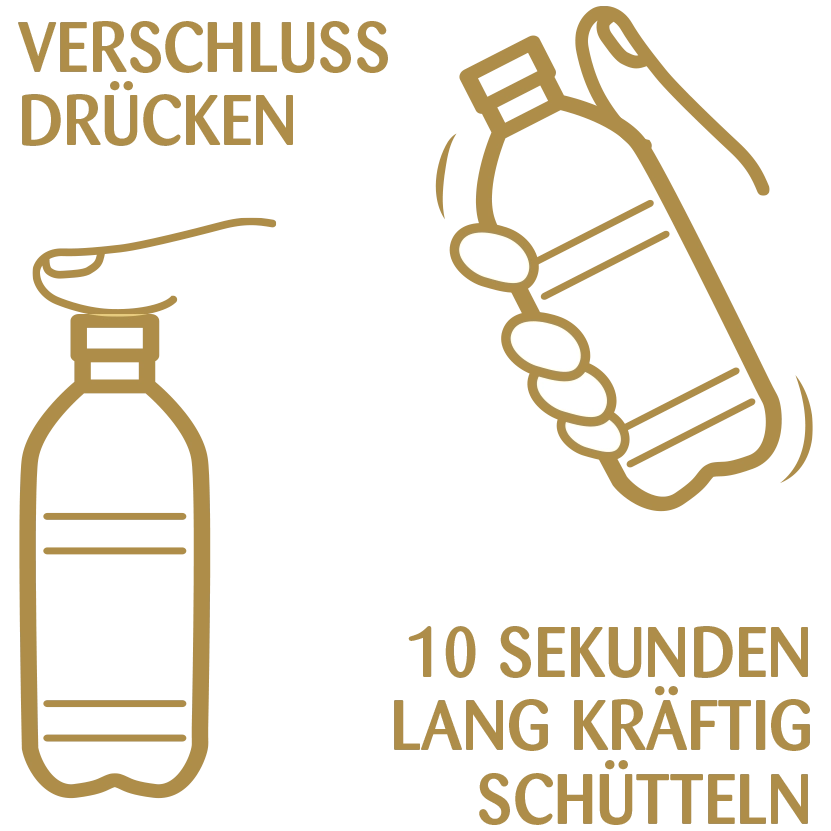 Drücken Sie ihn einfach, damit das Pulver mit dem Wasser in Kontakt kommt, und schütteln Sie die Flasche, um die Wirkstoffe aufzulösen.